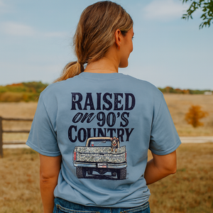 Wear your country roots with pride in this Girlie Girl Originals Raised on 90's Country T-Shirt. Nostalgic, fun, and unapologetically you—this tee celebrates the golden era of country music and the lifestyle that comes with it. Whether you're a die-hard fan or just love the vibe, this shirt lets your personality shine. Soft, comfortable, and designed to turn heads at the honky-tonk or anywhere else life takes you. Available in multiple sizes for the perfect fit.