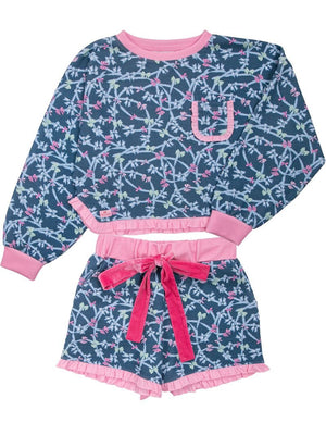Cozy up in this cute ruffle pajama set. Featuring crew neck sweatshirt, with front chest pocket, ruffle hem detail, rib cuffs and neckline. Shorts feature elastic waist with tie, slant pockets, and ruffle hem. Both feature Simply Southern logo. Made of 48% modal 48% polyester 4% spandex.