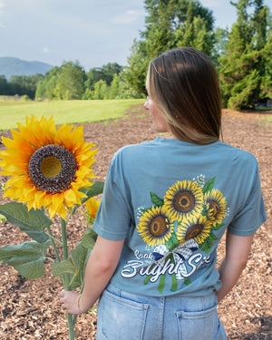 When life gives you sunflowers, make it a bouquet! Our Southernology® Bright Side Bouquet tee features a cheerful cluster of bright sunflowers paired with a hopeful message to remind you that every day holds a little sunshine. Printed on a Comfort Color ice blue short sleeve tee.