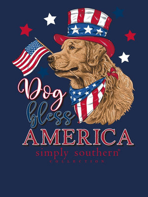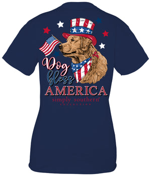 "Show off your love for America and your furry friend with the Simply Southern Dog Bless America T-Shirt. This unique and playful shirt is the perfect addition to any dog lover's wardrobe. Made with high-quality materials, it combines style and comfort for a one-of-a-kind look. Perfect for patriotic gatherings and everyday wear. Woof!"