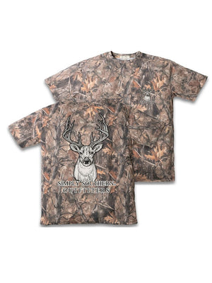 Made from 100% soft, breathable cotton, this short sleeve basic tee delivers all-day comfort in a clean, classic cut. This natural camo tee features the black and white image of a large deer.