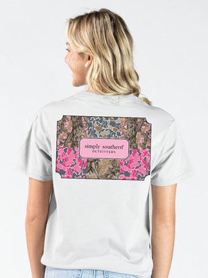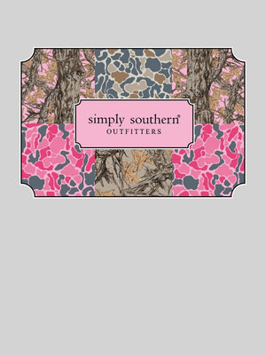 Made from 100% soft, breathable cotton, this short sleeve basic tee delivers all-day comfort in a clean, classic cut. This star grey tee features the Simply Southern logo with a border of paneled camo patterns.