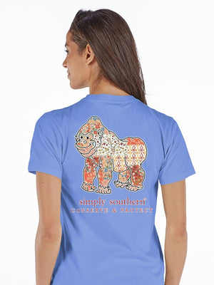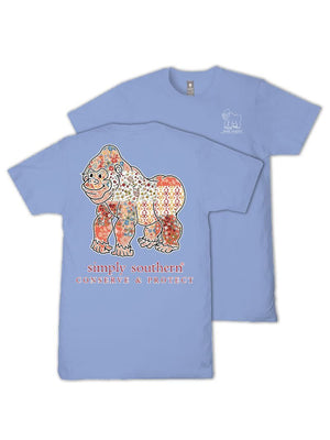 Made from 100% soft, breathable cotton, this short sleeve basic tee delivers all-day comfort in a clean, classic cut. This wave blue tee features a gorilla silhouette filled with a camo pattern and is part of our animal tracking program.