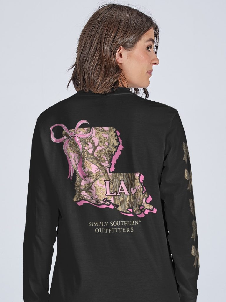 Show off your love for Your State in style with this playful Simply Southern long sleeve tee. The black shirt features a pink camo state silhouette with a pink ribbon and state abbreviation, bringing a fun twist to classic pride. Camo hair bows line the right sleeve, adding a cute, unique touch. Made from 100% cotton with unisex sizing, it’s comfy and perfect for anyone who wants to blend cozy with a splash of personality.