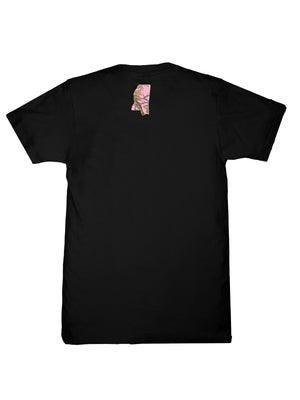 Made from 100% soft, breathable cotton, this short sleeve basic tee delivers all-day comfort in a clean, classic cut. This black tee features the state abbreviation filled with a pink camo pattern and outlined in lace. The state's shape is featured at the top center on the back.