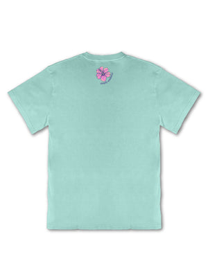 Made from 100% heavyweight cotton, this short sleeve mineral washed tee delivers structure and comfort. This tidepool blue tee features various beach themed items, several in the form of postage stamps, and the phrase 'Saltwater heals all wounds'.