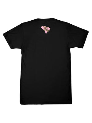 Made from 100% soft, breathable cotton, this short sleeve basic tee delivers all-day comfort in a clean, classic cut. This black tee features the state abbreviation filled with a pink camo pattern and outlined in lace. The state's shape is featured at the top center on the back.
