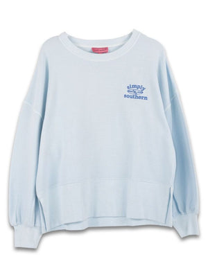 The Surf Crew features a textured rib fabric, oversized fit, crew neckline, rib collar, cuff, and hem, as well as an embroidered multi-media design on the back and embroidered Simply Southern logo on the chest