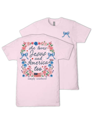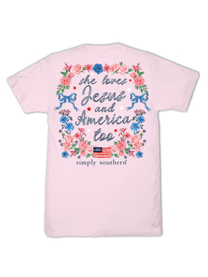 Made from 100% soft, breathable cotton, this short sleeve basic tee delivers all-day comfort in a clean, classic cut. This peony pink tee features the phrase 'She loves Jesus and America too' in a frame of flowers, ribbons, and the flag.