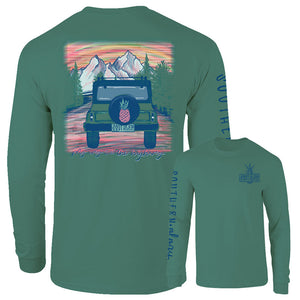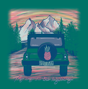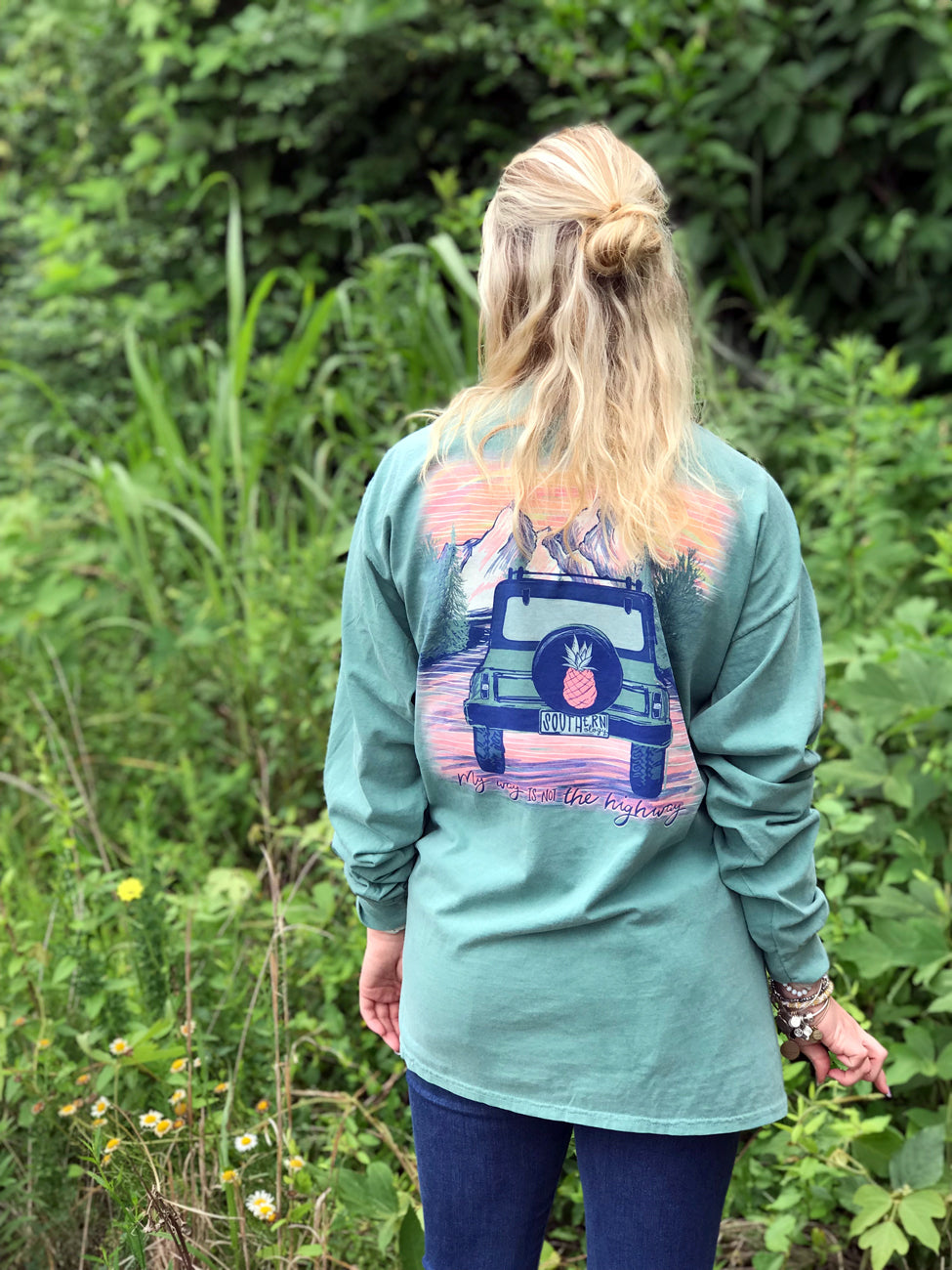 Life is a highway - and we're ready to ride it with our windows down and radio turned up! Sit back, relax, and take in the views of the Blue Ridge Mountains along a winding road in this new My Way is Not the Highway t-shirt from Southernology®! This exclusive hand-drawn design is printed on an long sleeve Light Green Comfort Colors t-shirt.