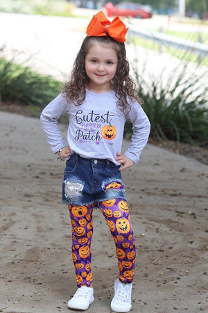 Youth Baby Cutest Pumpkin in the Patch Fall Long Sleeve Top with Denim Shorts & Leggings Set
