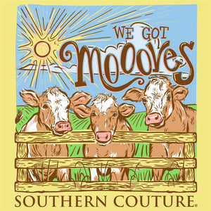 "Moo-ve in style with this quirky Southern Couture cow t-shirt. Featuring a playful "We Got Mooves" design, it's the perfect addition to your casual wardrobe. Embrace the fun and show off your love for bovine fashion with this classic tee. (Cow puns not included.)"