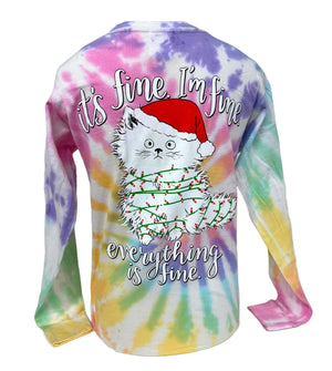 Get into the holiday spirit with the Southern Attitude Christmas Fine Cat Tie Dye T-Shirt! This long sleeve tee features a fun and festive cat design, perfect for all those cat lovers out there. Plus, the tie dye adds a unique touch to your holiday wardrobe. Meow-velous!