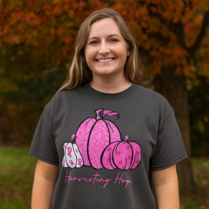 Harvesting Hope is the latest design in our Cure Tees Collection! Pink and white pumpkins featuring pink ribbons is perfect for the fall season. This classic fit, pre-shrunk, jersey knit tee is made from 6-ounce, 100% cotton.