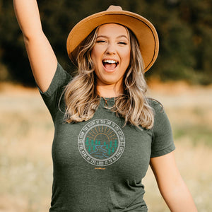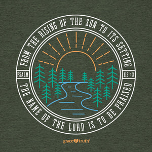 Breathe in the fresh air and praise the Lord in this nature-themed “The Name of the Lord” grace & truth® T-shirt in Military Green Heather. From the moment you wake until you lay your head down to sleep, every step, and every breath, is a reason to be grateful.