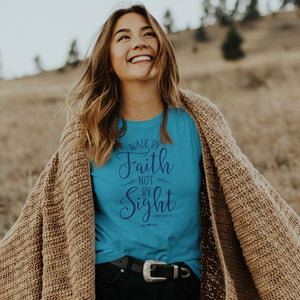Stand tall and keep walking the walk in this “Walk by Faith” grace & truth® T-shirt in Caribbean Blue. How we live our lives is not necessarily a matter of circumstance—it is also a matter of choice. Choose faith, and choose to follow Jesus no matter what mountains you face. He walks with you, and when the way becomes too rough, He will hold you in the palm of His mighty hand. This is how we walk by faith.