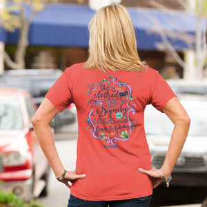 Greet the day with a smile in your heart when you wear this artsy “Strength & Dignity” Cherished Girl® T-Shirt in Coral Silk. With a classic fit and a memorable message of Godly encouragement, this pretty tee makes a thoughtful gift for yourself, or a worthy woman you know.