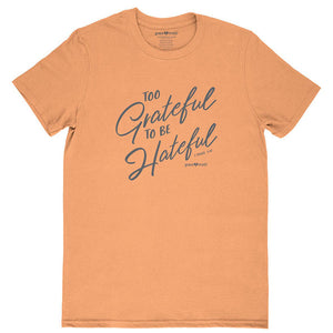 Share an attitude of gratitude in this cool “Too Grateful” grace & truth® T-Shirt in Cantaloupe. Following Jesus is a full-time gig — who has time to judge others, to be petty or jealous, when there are so many blessings for us to count? God’s Holy Word, the Bible, instructs us on how to mold our character, how to treat others, and how to show the love of Jesus to a world in need. There simply isn’t time to be a hater, when we love the Lord.