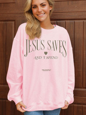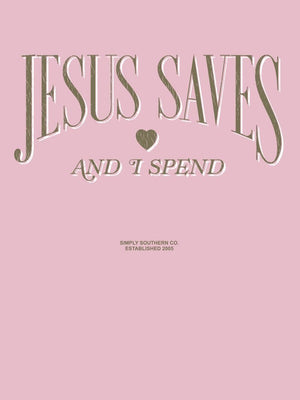 Stay cozy while showing off your fun and quirky style with the Simply Southern Jesus Saves Long Sleeve Crew Sweatshirt. Featuring a playful design that reads "Jesus Saves and I Spend", this sweatshirt is perfect for those who don't take themselves too seriously. Spread some humor and love with this unique sweatshirt.