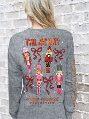 Get ready to crack some holiday cheer with the Simply Southern Nuts Nutcracker Christmas Long Sleeve T-Shirt. This playful shirt features a nutcracker design and a clever play on words. Stay festive and comfy with long sleeves perfect for the winter season.