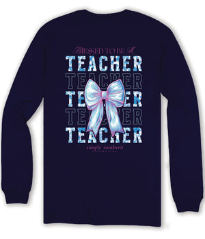 Rock your teaching style with the Simply Southern Blessed Teacher Bow Long Sleeve T-Shirt. This fun and quirky shirt is a perfect addition to any educator's wardrobe. Featuring a stylish bow design and a positive message, this shirt is sure to bring smiles and good vibes to your day. Stay cozy and spread joy with this Blessed Teacher T-Shirt!