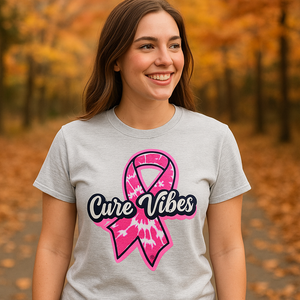 IT'S ALL ABOUT POSITIVITY, FIGHTING SPIRIT, AND CURE VIBES. SHOW YOUR FIGHT OR SUPPORT IN THIS BREAST CANCER AWARENESS TEE FEATURING A PINK AND WHITE TIE DYE RIBBON. THIS CLASSIC FIT TEE IS MADE FROM MADE FROM 99% PRE-SHRUNK COTTON AND 1% POLYESTER.