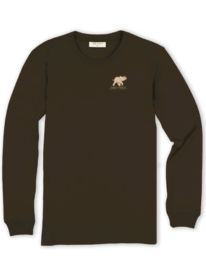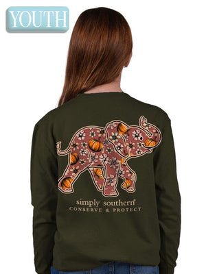 Umber long sleeve shirt with the phrase 'Conserve and Protect' and an elephant filled with a pumpkin pattern. Simply Southern logo below and on left chest. 100% cotton. Unisex sizing. Track shirt.