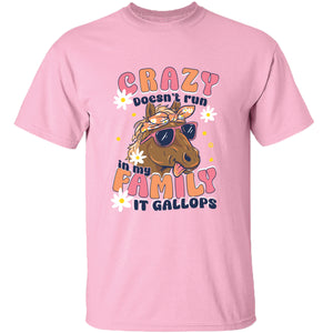 Express your quirky side with this playful and humorous Girlie Girl Originals Crazy Family Horse T-Shirt. Featuring a statement that "crazy doesn't run in my family, it gallops," this shirt is perfect for those who don't take themselves too seriously. Add some fun to your wardrobe today!