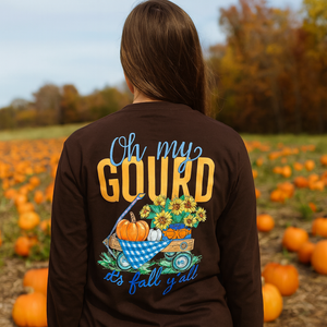 Oh My Gourd, it's fall y'all! The end of summer in the south seems to stretch on endlessly and the coming of fall is practically it's own holiday! This design showcases a festive wagon full of pumpkins and sunflowers. You'll be warm and comfortable in this long sleeve, classic fit tee made from pre-shrunk, 100% ringspun cotton.