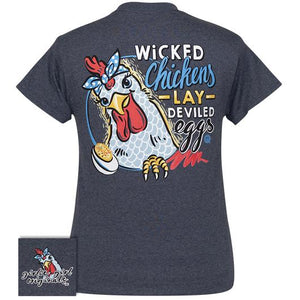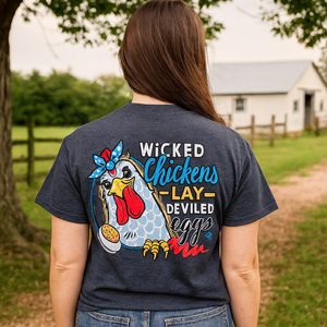 Wicked chickens lay deviled eggs! This comfortable, classic fit, pre-shrunk tee is made from 50% cotton and 50% polyester.