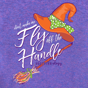Don't make me fly off the handle! If you've ever heard this Southern saying, you know things are about to get dire. Someone's mad, and maybe even a little witchy! Just in time for fall, this fun design from Southernology features a hand-drawn witch's hat and classic wooden broom. This exclusive design is printed on the back of a gorgeous heathered pink and purple Lilac Gildan t-shirt, while the Southernology pineapple logo in orange is printed on the front.