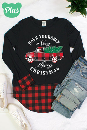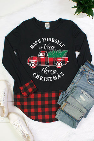 Have Yourself a Very Merry Christmas Truck Plaid Cuff and Hem Holiday Long Sleeve Shirt
