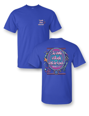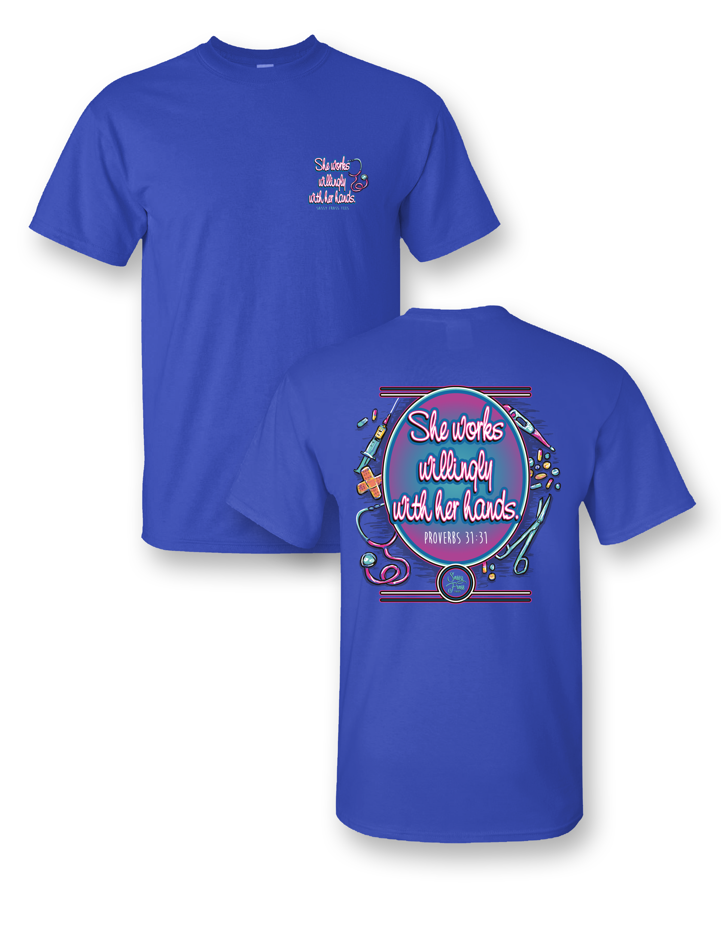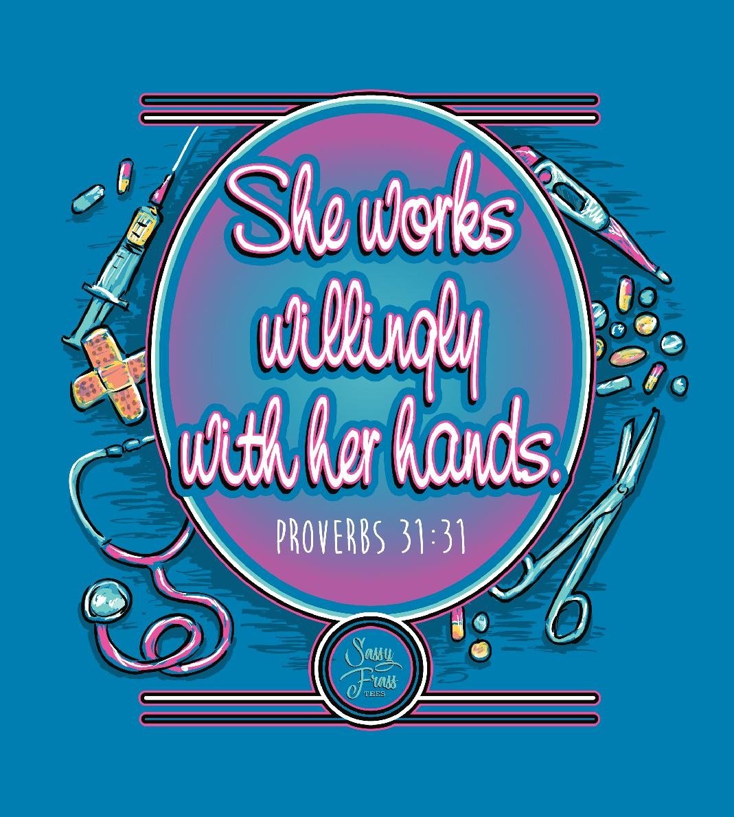 Sassy Frass Proverbs Nurse She Works Willingly with her Hands Bright Girlie T Shirt