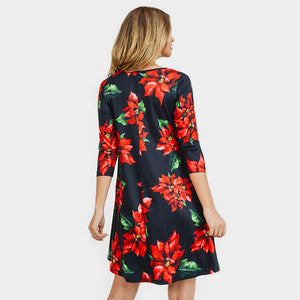 Christmas Poinsettia Flower Print Holiday Casual A-Line Dress