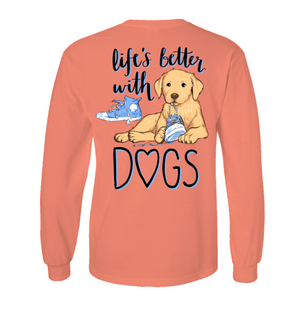 Show off your preppy and playful side with our Southern Attitude "Life's Better With Dogs" long sleeve t-shirt. Comfortable and stylish, this tee is perfect for any dog lover. Embrace a laid-back lifestyle with this quirky and fun addition to your wardrobe.