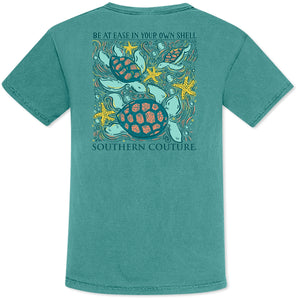 "Unleash your inner turtle with the Southern Couture Be At Ease in Your Own Shell T-Shirt. Made with comfortable Comfort Colors material, this tee will keep you feeling relaxed and confident. Embrace your unique self with this quirky and fun t-shirt. Take it easy and let your shell be your guide."