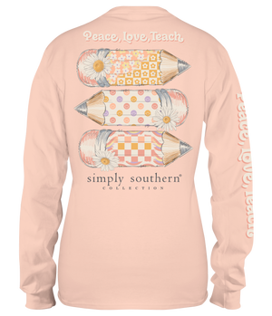 Show your appreciation for the most important people in your life with this witty and charming Simply Southern Peace Love Teach Long Sleeve T-Shirt. This comfy long sleeve tee features a heartfelt message and fun colors: a great way to give a nod to your favorite teachers (or remind yourself why you love 'em so!). Let peace, love, and teaching abound!