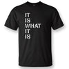 It is what it is is printed on a black v-neck bella canvas shirt and comes in sizes S-3X.