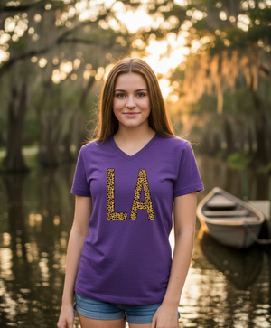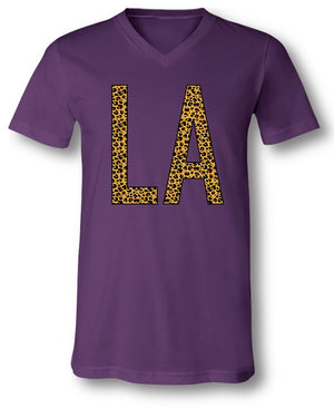 Louisiana Love v-neck tee. Gildan purple with leopard print letters. Available in sizes S-3X.