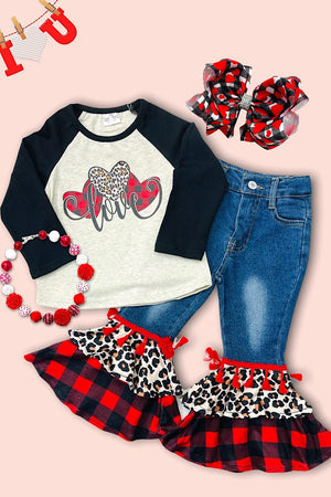 Youth Baby Toddler Love Raglan & Denim Bell Leopard Plaid Pants Valentines Day Set