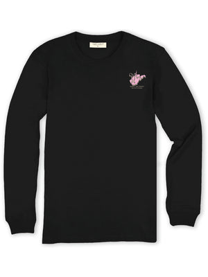 Show off your love for Your State in style with this playful Simply Southern long sleeve tee. The black shirt features a pink camo state silhouette with a pink ribbon and state abbreviation, bringing a fun twist to classic pride. Camo hair bows line the right sleeve, adding a cute, unique touch. Made from 100% cotton with unisex sizing, it’s comfy and perfect for anyone who wants to blend cozy with a splash of personality.