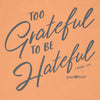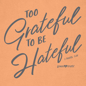 Share an attitude of gratitude in this cool “Too Grateful” grace & truth® T-Shirt in Cantaloupe. Following Jesus is a full-time gig — who has time to judge others, to be petty or jealous, when there are so many blessings for us to count? God’s Holy Word, the Bible, instructs us on how to mold our character, how to treat others, and how to show the love of Jesus to a world in need. There simply isn’t time to be a hater, when we love the Lord.