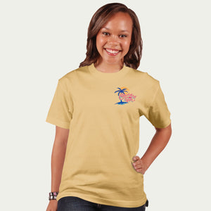 The front of this classic fit T-shirt features a palm tree and Cherished Girl emblem, and the back displays flip flops on a sandy beach against a tropical sunset scene. This pretty tee brings the feeling of summer any day of the year. #walkbyfaith #cherishedgirl