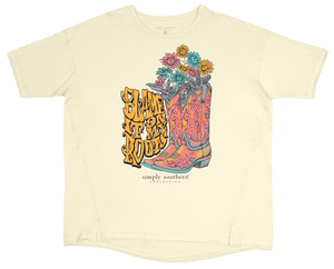 "Get ready to kick up some style with the Simply Southern My Roots Boots Boxy T-Shirt! Made from 100% cotton, this boxy t-shirt is perfect for showing off your Southern roots with a touch of humor. The playful design and comfortable fabric make it a must-have for any casual outfit. Yeehaw!"
