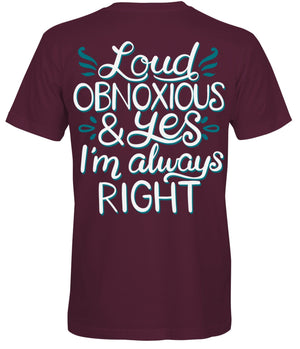 Let the world know you don't take yourself too seriously with this Southern Attitude Loud Obnoxious T-Shirt! No need to keep your opinions to yourself, this shirt proudly proclaims that you're ALWAYS right! (Even when you're wrong ;).