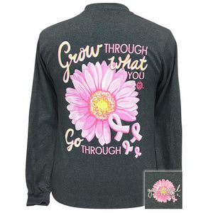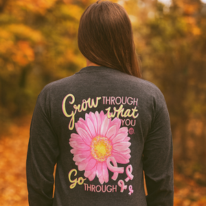 Grow Through What You Go Through in this Gerber Daisy cancer awareness themed design. You'll be warm and comfortable in this long sleeve, classic fit tee made from pre-shrunk, 50% cotton/ 50% Polyester.
