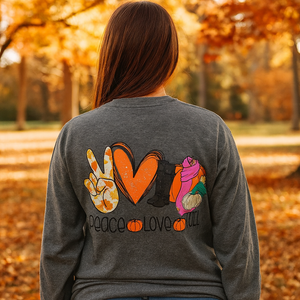 Peace Love Fall! You'll be warm and comfy in this classic fit, pre-shrunk, jersey knit tee made from 50% cotton and 50% polyester.