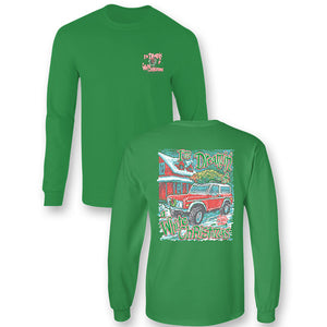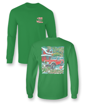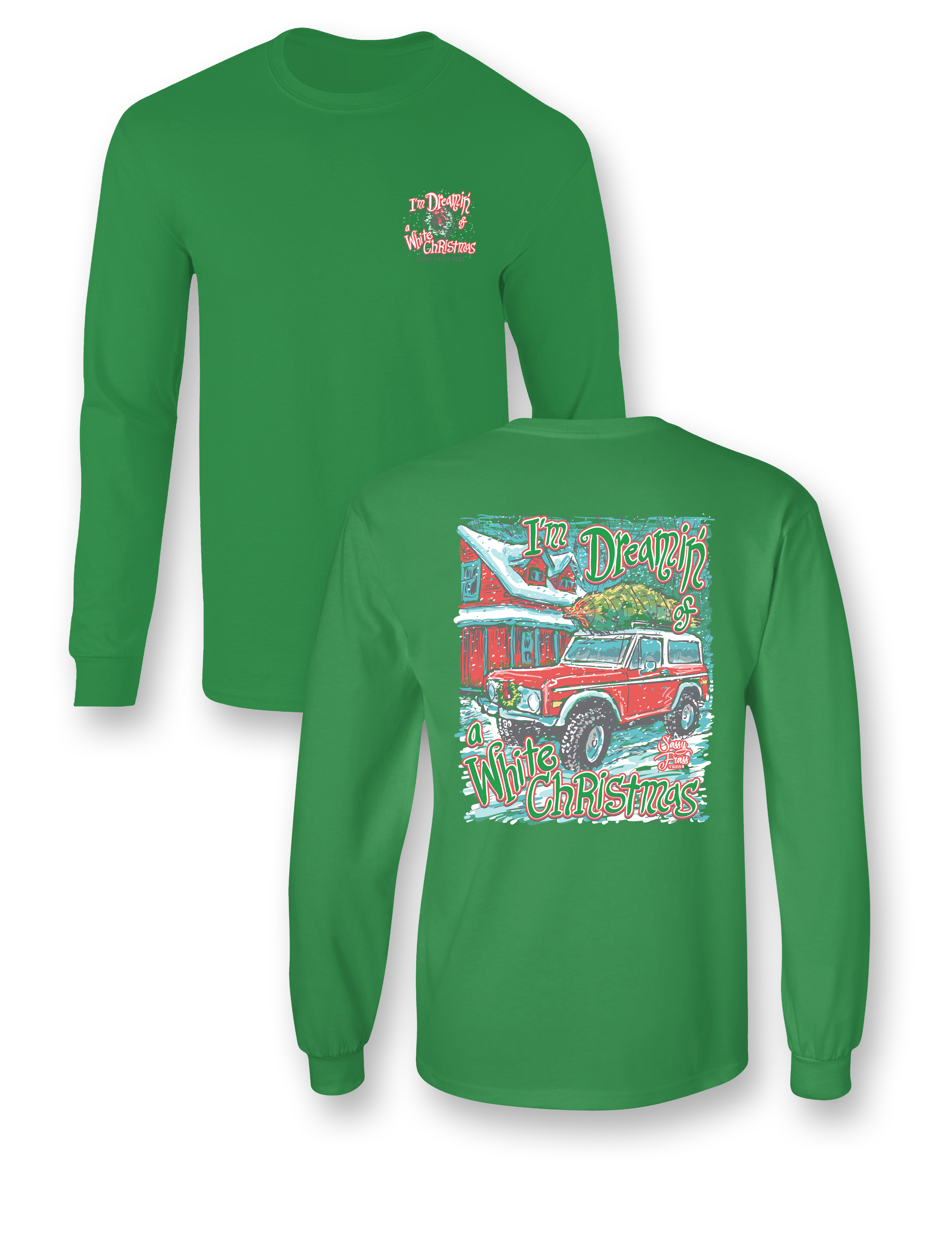 I'm dreaming of a white Christmas t-shirt perfect with the retro red SUV and a little snow on the ground to get you in the mood. Printed on our long sleeve green tee and available in sizes S-3X.