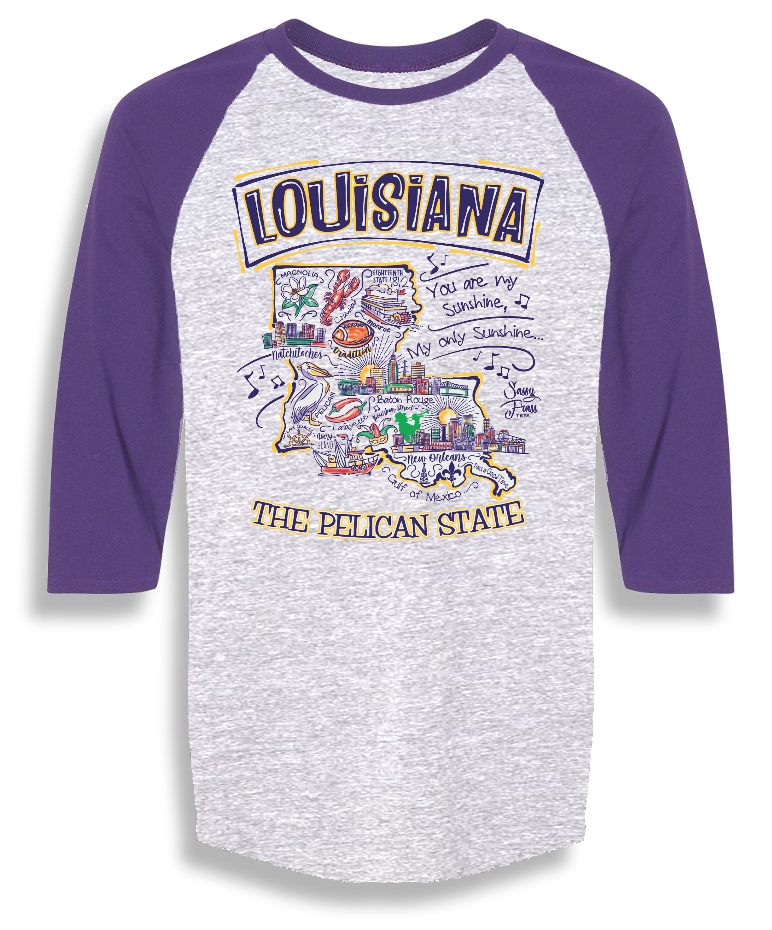 Louisiana Raglan is printed on a Next Level Raglan with a heather grey body and pruple sleeves and maps out all the important landmarks in LA! Sizes S-3X