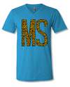 Printed on Bella Canvas Blue with leopard print MS on the front. V-neck, available in in sizes S-3X.